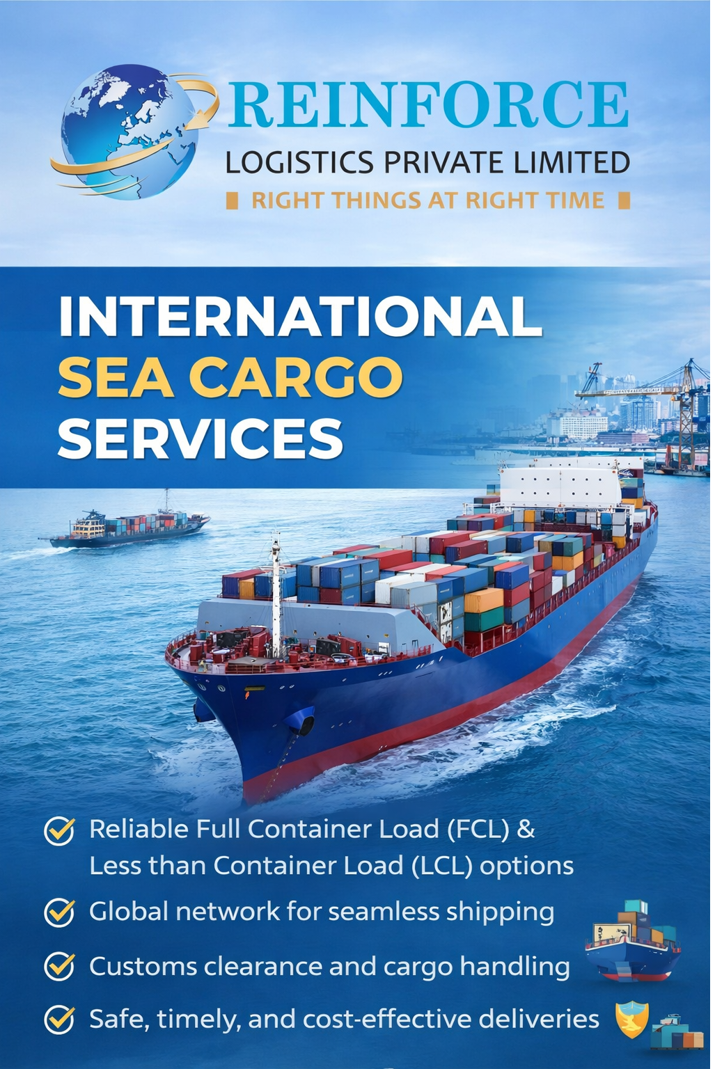 International Sea Cargo Services – Reinforce Logistics Pvt Ltd Reinforce Logistics Pvt Ltd offers reliable and cost-effective International Sea Cargo Services designed to support businesses of all sizes in their global trade operations. With a strong network of shipping lines, agents, and partners across major ports worldwide, we ensure seamless movement of cargo from origin to destination with complete transparency and efficiency. Our sea freight solutions include both Full Container Load (FCL) and Less than Container Load (LCL) services, allowing clients the flexibility to choose the most suitable and economical option based on their shipment size and urgency. We handle a wide range of cargo, including general goods, industrial equipment, project cargo, and specialized shipments, ensuring proper care and compliance at every stage. At Reinforce Logistics Pvt Ltd, we manage the entire shipping process—from cargo booking, documentation, and customs clearance to container stuffing, port handling, and final delivery. Our experienced team closely monitors each shipment, providing timely updates and proactive communication to keep clients informed throughout the journey. We prioritize safety, timely delivery, and cost optimization by selecting the best shipping routes and schedules. Our expertise in international trade regulations and documentation helps minimize delays and ensures smooth clearance at both origin and destination ports. Whether you are exporting from India or importing goods from global markets, Reinforce Logistics Pvt Ltd is committed to delivering dependable sea freight solutions tailored to your business needs, helping you expand your reach across international markets with confidence.